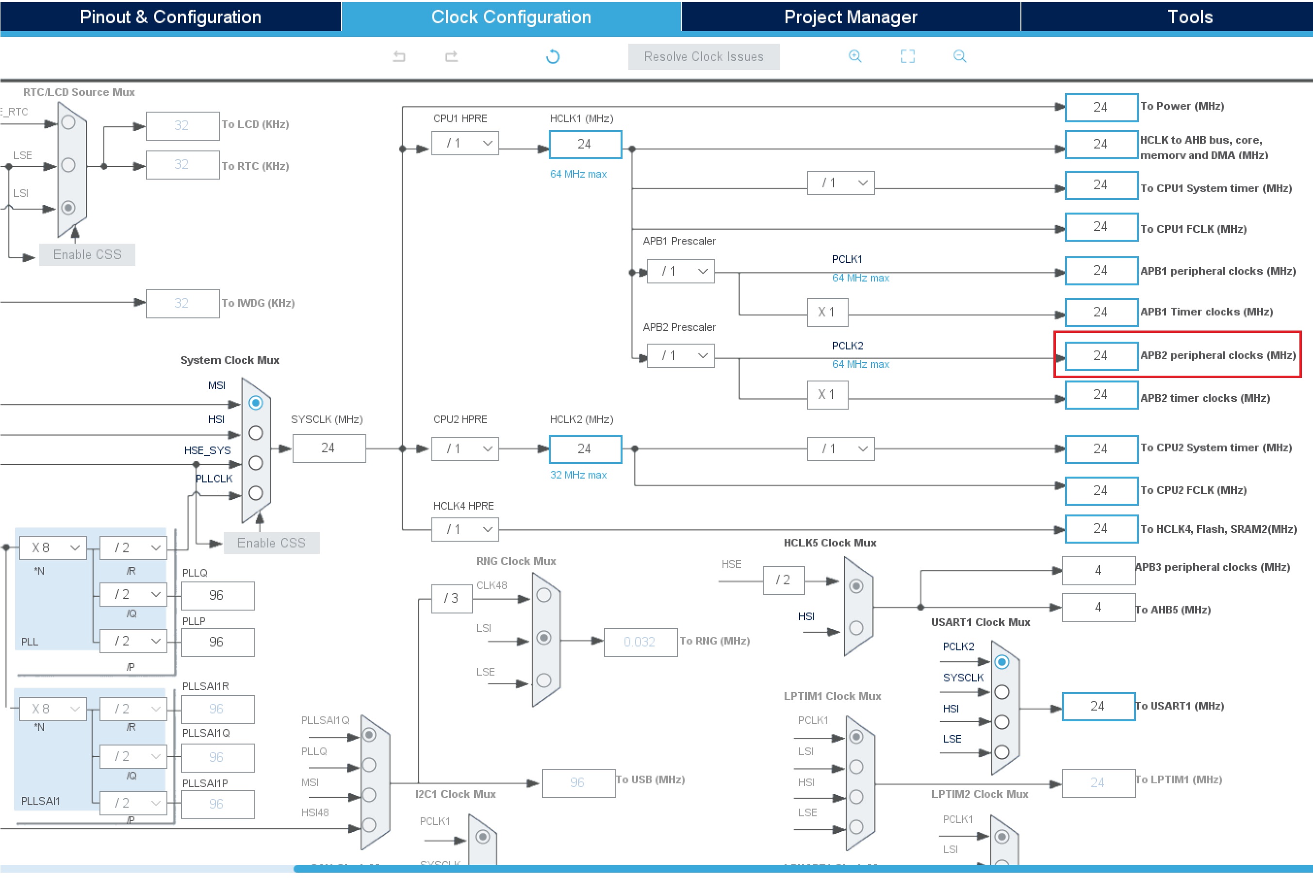 - STM32WB에서 SPI1의 경우 APB2에 속해있으므로 APB2의 클럭을 조절해줘야 함