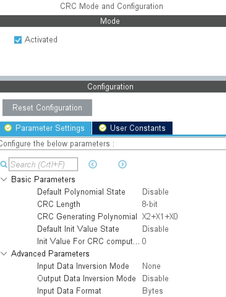 - 센서와의 통신에 사용할 I2C 설정 및 데이터 검증에 CRC-8 사용하므로 CRC 사용 설정
