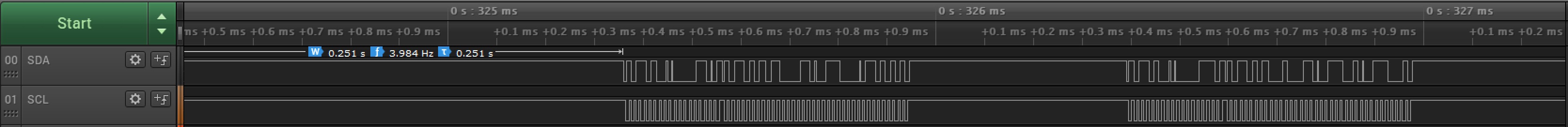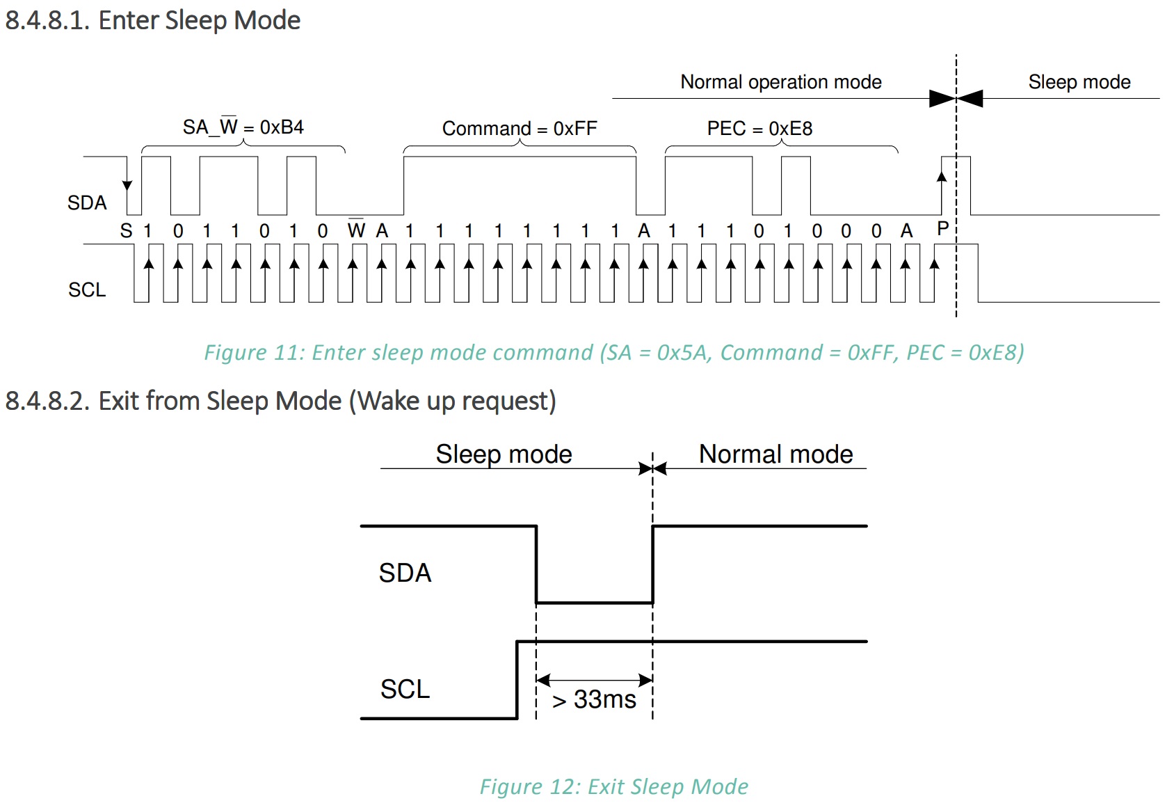 - 슬립 모드를 종료하기 위해선 SCL이 High인 상태에서 SDA를 최소 33ms 동안 Low로 유지하거나