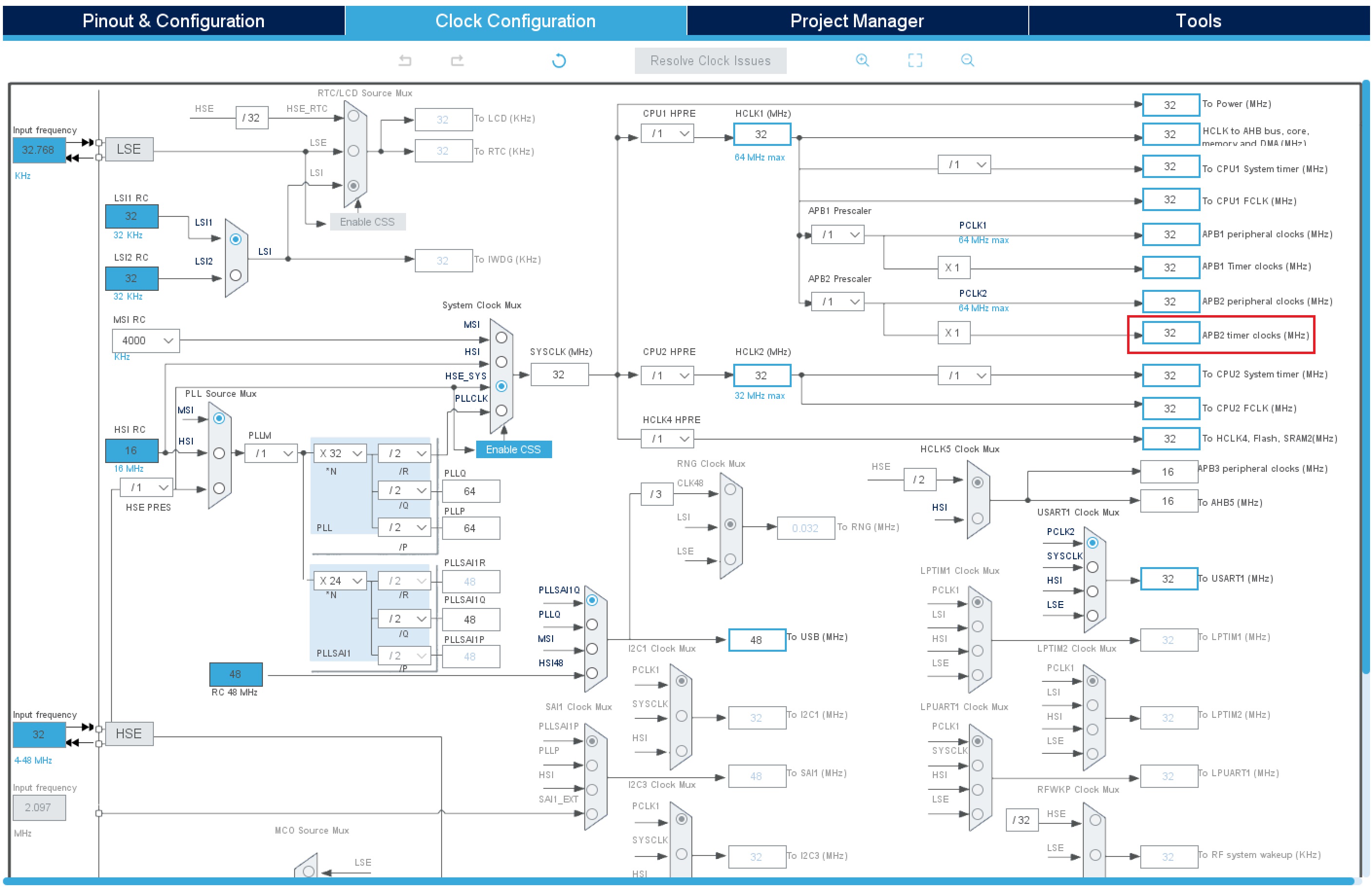 - (위 설정의 경우, TIM2는 APB1에 속하고 APB1의 타이머 클럭은 32MHz 이다)