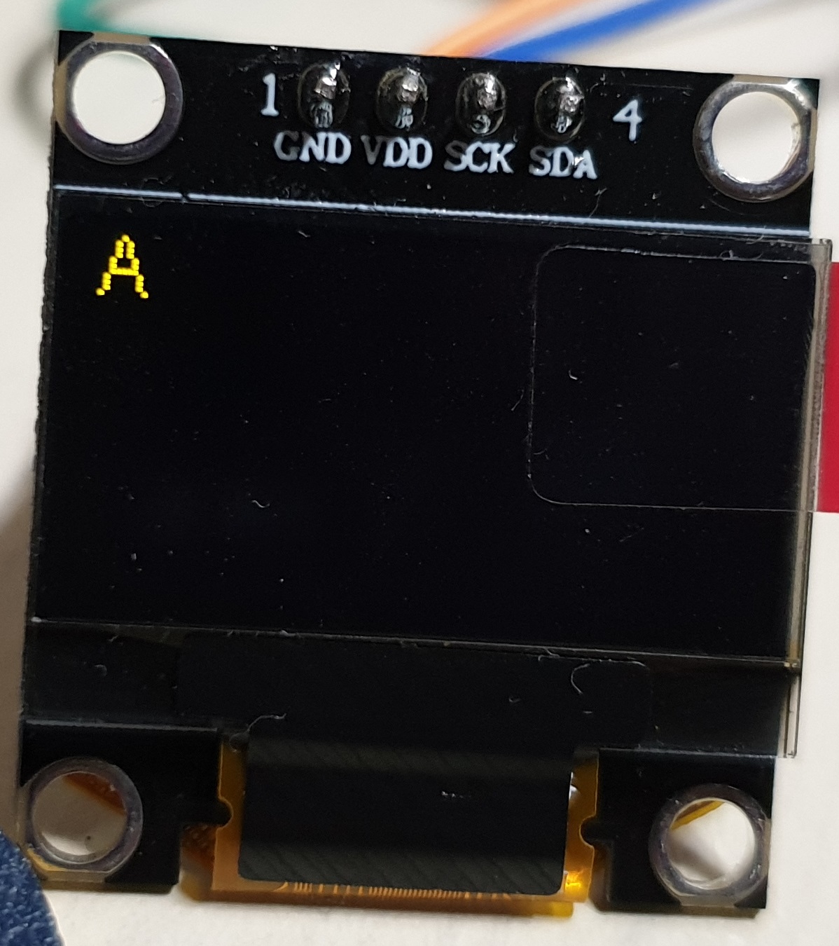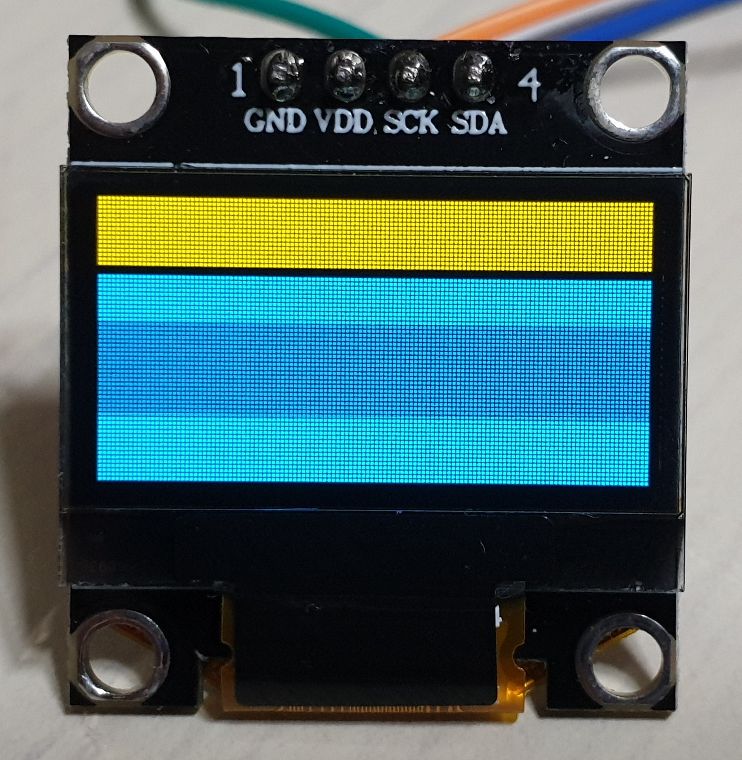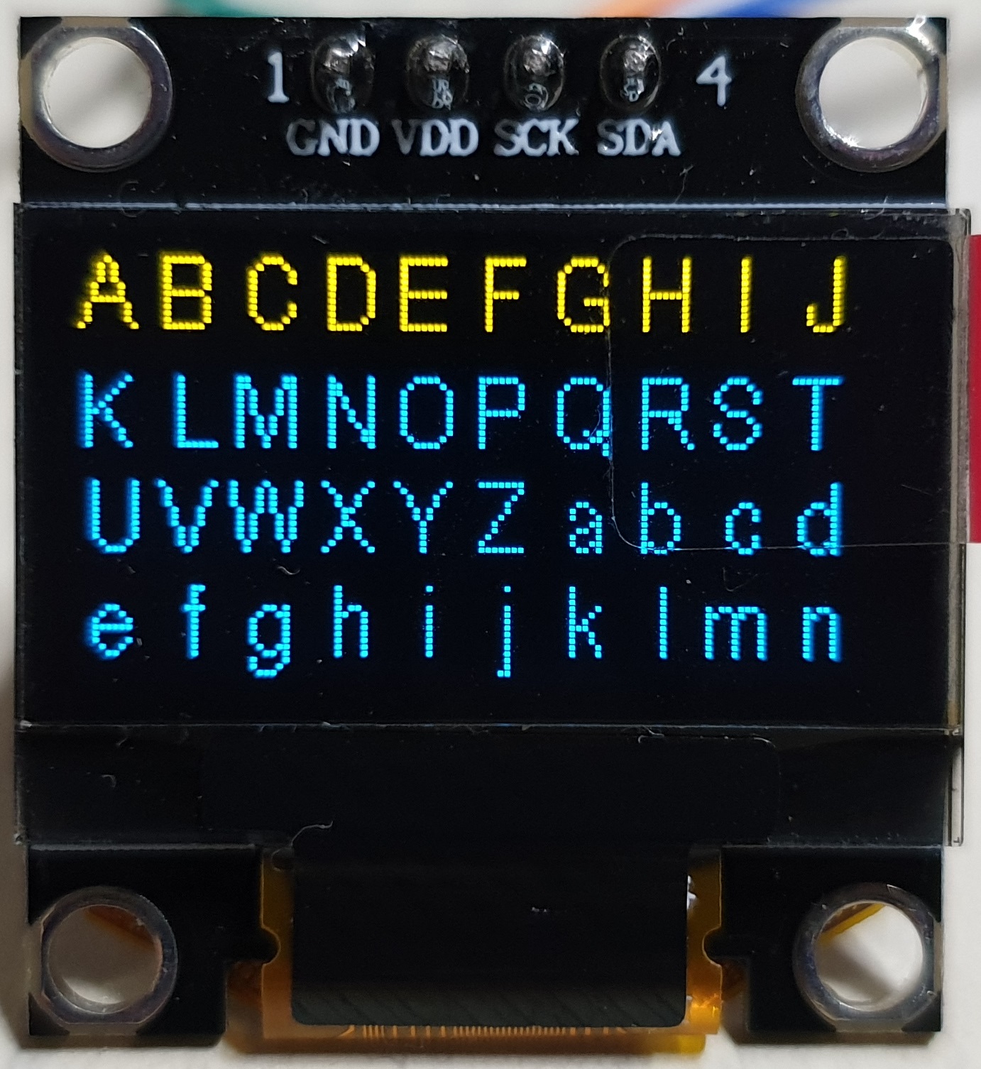 - 노란색 영역을 상단으로 사용하기 위해 0xC8 명령어를 사용해 COM 출력 스캔 방향을 COM63 to COM0 으로 바꿔 상하 반전을 시키고 0xA1 명령어를 통해 127 열을 SEG0 으로 리맵핑 하여 좌우를 반전 시켜줌