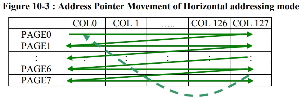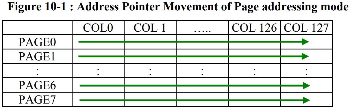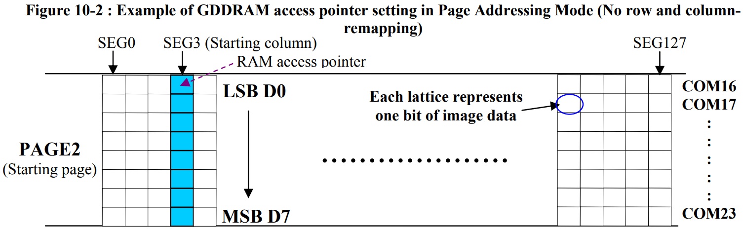 - GDDRAM의 형태는 크게 128x64 화면의 세로열(64열)을 8등분하여 각각 8개의 행을 가진 페이지로 구성되어 있으며 (순서는 화면 상단(0)->하단(7)) 각 페이지는 128개의 1바이트 크기 세로열을 가지고 있다
