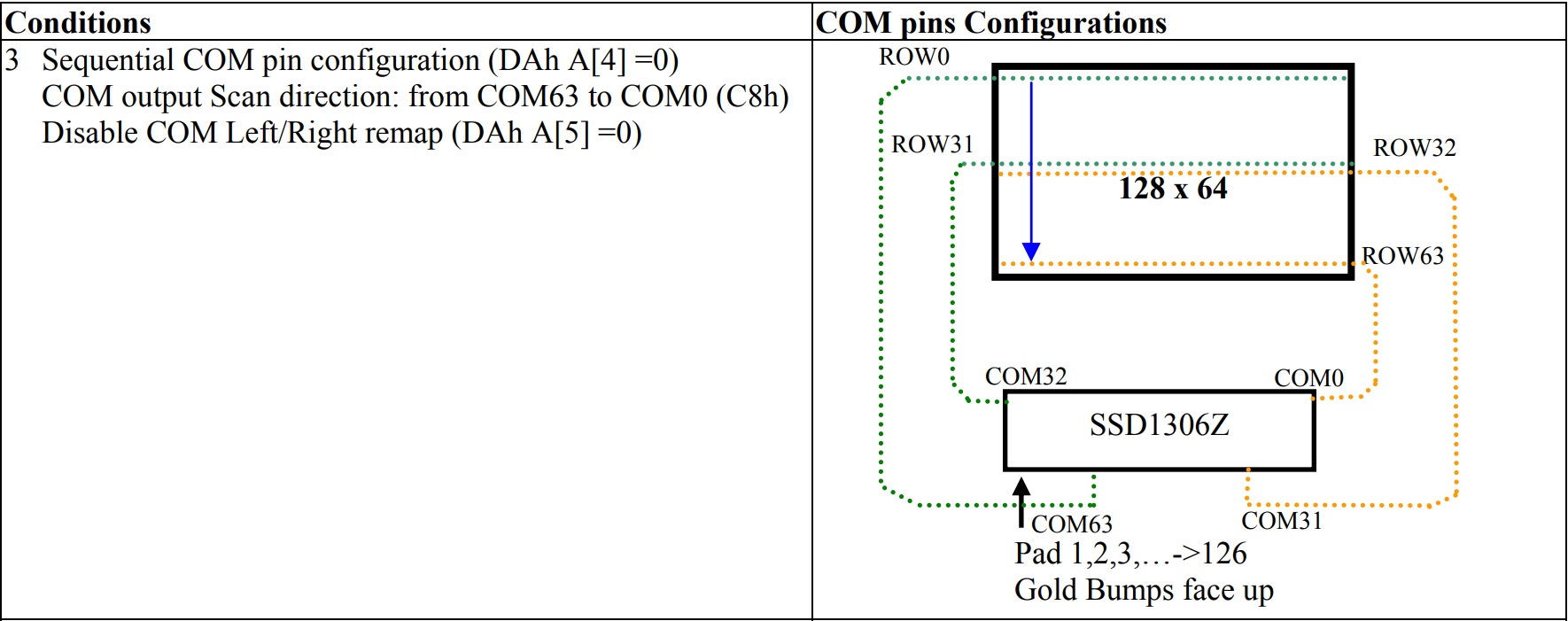 - Set COM Pins hardware configuration의 경우, COM0~COM63이 순차적으로 화면 최상단에서 최하단까지 이어지는 Sequential 핀 배열과 COM0~COM31, COM32~COM63 이 교차되어 나열되는 (COM0, COM31, COM2... / COM31, COM0, COM32...) Alternative 핀 배열의 두 방법이 있다